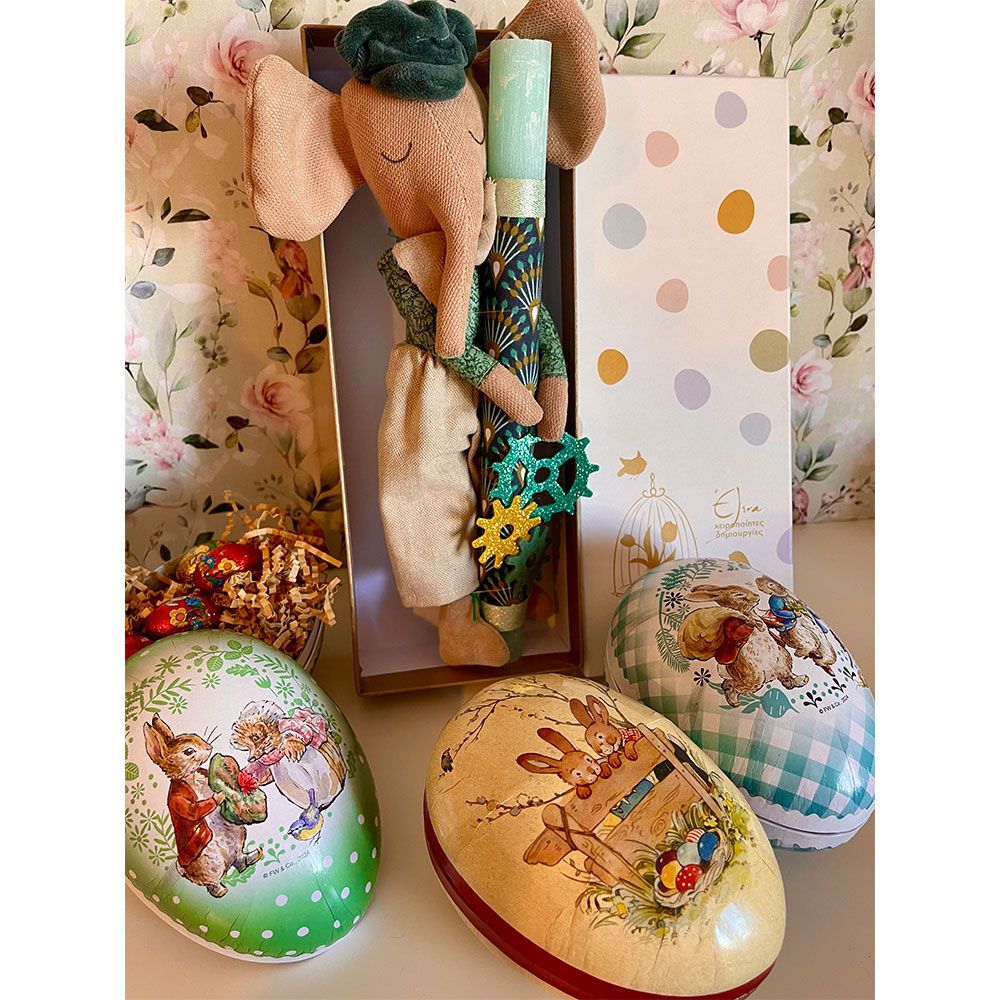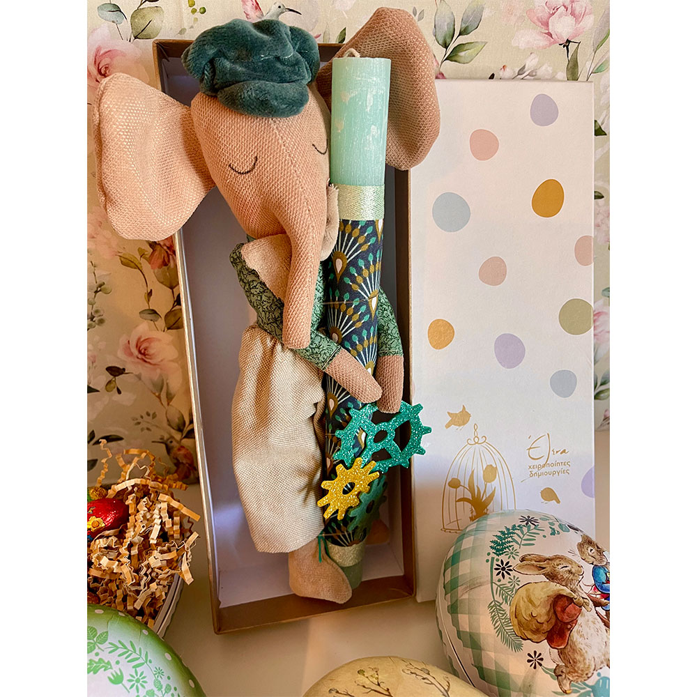 Εξολοκλήρου χειροποίητος ελέφαντας 30  εκ περίπου  με σκούφο σε αρωματική λαμπάδα 30 εκ.Ραμμένος και ζωγραφισμένος στο χέρι με προσόχη στη κάθε λεπτομέρεια!