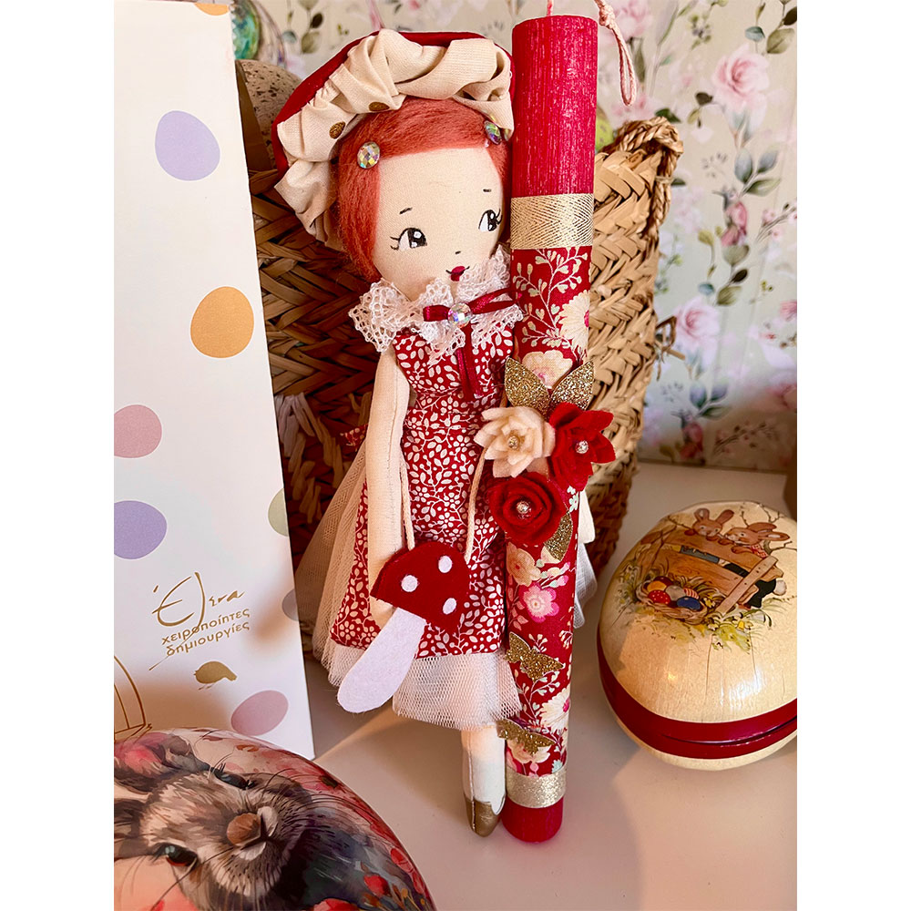 Χειροποίητη κούκλα ύψους 25 εκ σε αρωματική στολισμένη λαμπάδα 30 εκ. Ραμμένη και ζωγραφισμένη στο χέρι με προσοχή στη κάθε λεπτομέρεια!