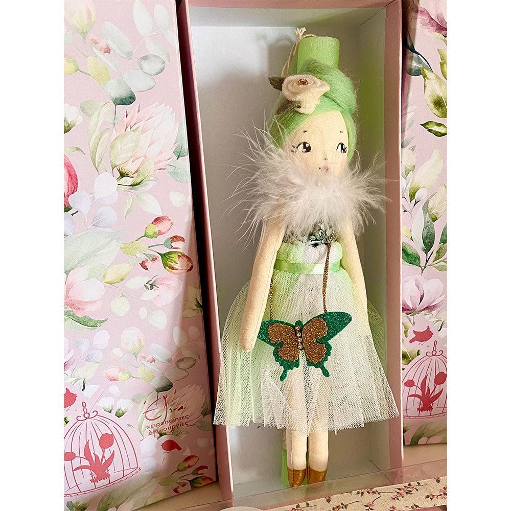 Χειροποίητη κούκλα ύψους 25 εκ σε αρωματική στολισμένη λαμπάδα 30 εκ. Ραμμένη και ζωγραφισμένη στο χέρι με προσοχή στη κάθε λεπτομέρεια!