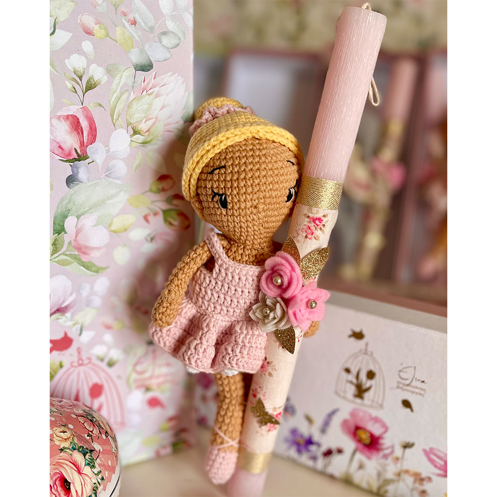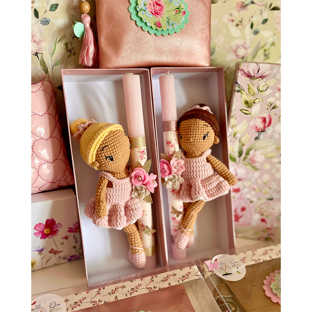 Χειροποίητη πλεκτή κούκλα 22 εκ περίπου σε αρωματική στολισμένη λαμπάδα 30εκ . Τα ρούχα τουσ μπαινοβγαίνουν για παιχνίδι και είναι από βαμβακερά υποαλλεργικά νήματα.