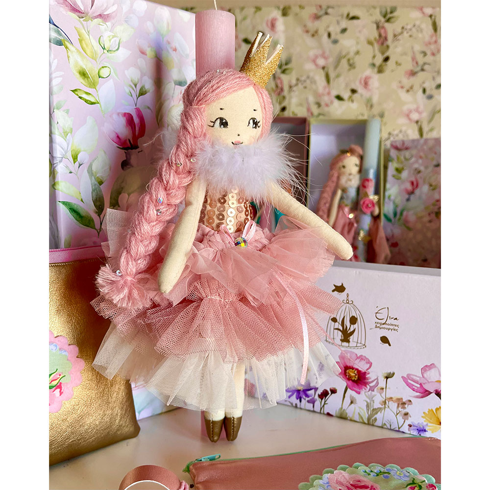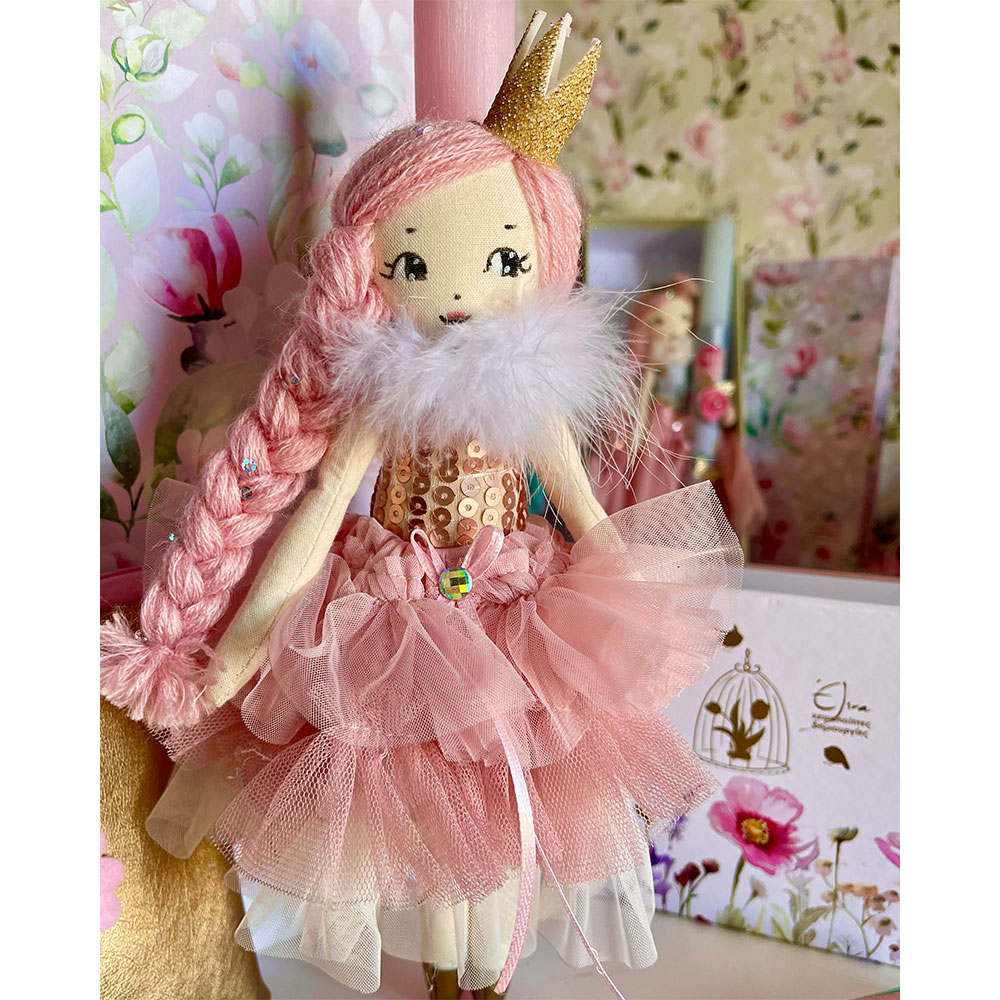 Χειροποίητη κούκλα 25 εκ πάνω σε αρωματική στολισμενη λαμπάδα ύψους 30 εκ . Ραμμένη και ζωγραφισμένη στο χέρι με προσοχή στη κάθε λεπτομέρεια!