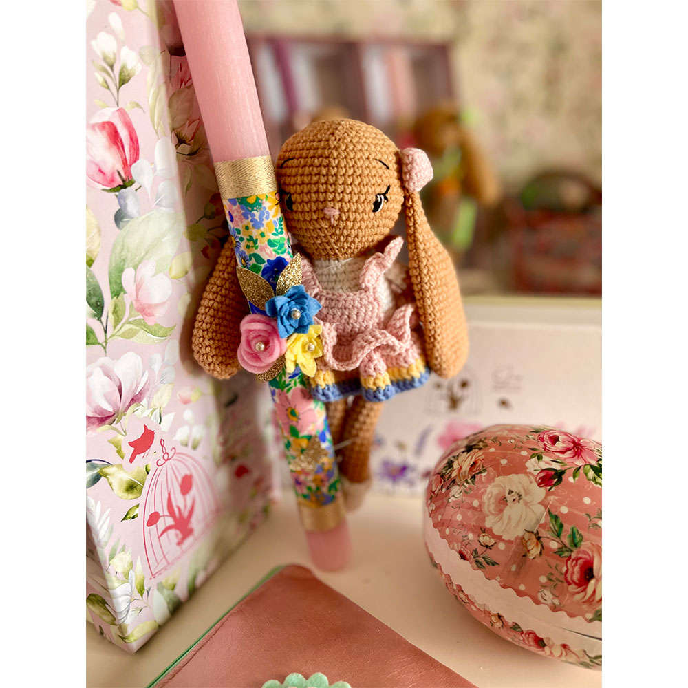 Λαμπάδα με χειροποίητο πλεκτό κουνελάκι {ροζ-κιτρινο-σιελ}