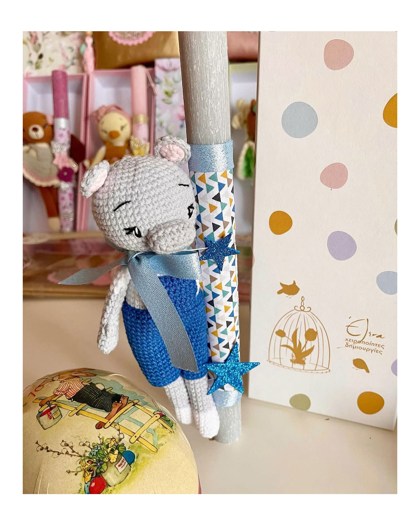 Αρωματική λαμπάδα 30 εκ στολισμένη με χειροποίητο πλεκτό ιπποπόταμο 20 εκ περίπου